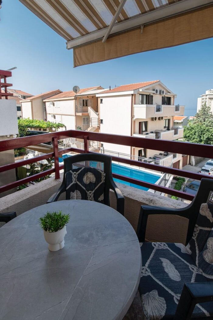 Z salonu prowadzi wyjście na balkon, na którym naturalnie toczy się wakacyjne życie. Poranna kawa, chwila ciszy w ciągu dnia, wieczorne rozmowy przy ciepłym powietrzu znad morza. Z balkonu widać morze, co sprawia, że to klasyczny nocleg nad Adriatykiem w Czarnogórze, wybierany przez osoby szukające spokoju i przestrzeni.