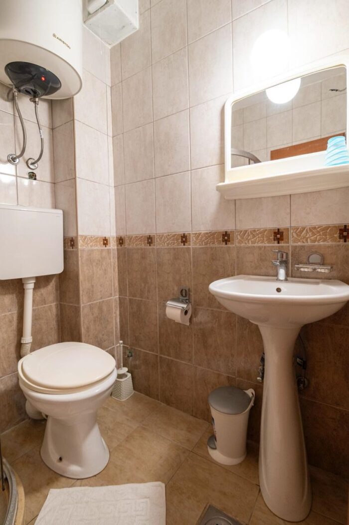 Łazienka jest funkcjonalna i zadbana, z prysznicem, pralką oraz suszarką do włosów. Takie rozwiązanie docenią osoby planujące apartament na dłuższy pobyt w Czarnogórze.