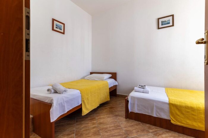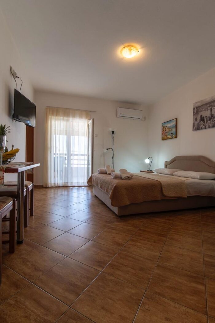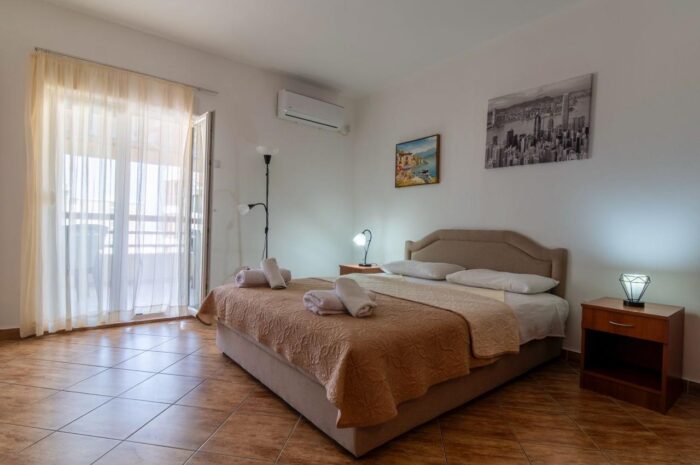 Apartament jest jasny, przestronny i funkcjonalny. W salonie znajduje się wygodne łóżko, klimatyzacja oraz miejsce do odpoczynku po dniu spędzonym na plaży. Oddzielna sypialnia z dwoma pojedynczymi łóżkami daje komfort i prywatność, szczególnie przy pobytach rodzinnych. To układ, który dobrze sprawdza się przy wynajmie wakacyjnym w Czarnogórze.