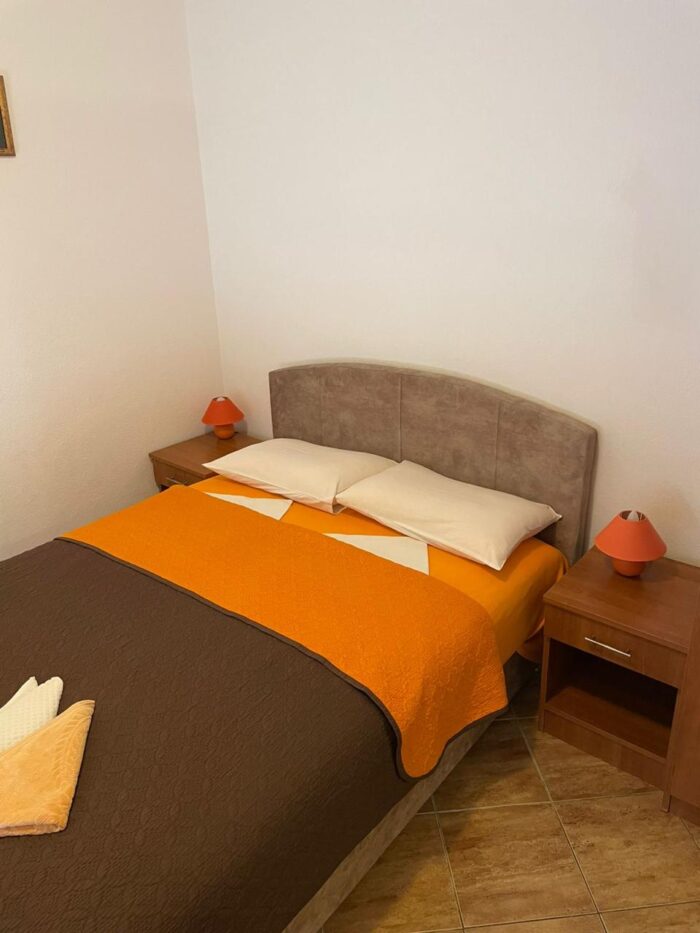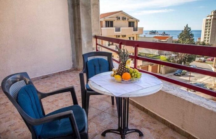 Z apartamentu prowadzi wyjście na balkon, z którego widać morze i zabudowę okolicy. To miejsce na poranną kawę, szybkie śniadanie albo wieczorny odpoczynek po dniu spędzonym na plaży. Taki widok sprawia, że to klasyczny nocleg nad morzem w Czarnogórze, wybierany przez osoby ceniące spokój i światło.