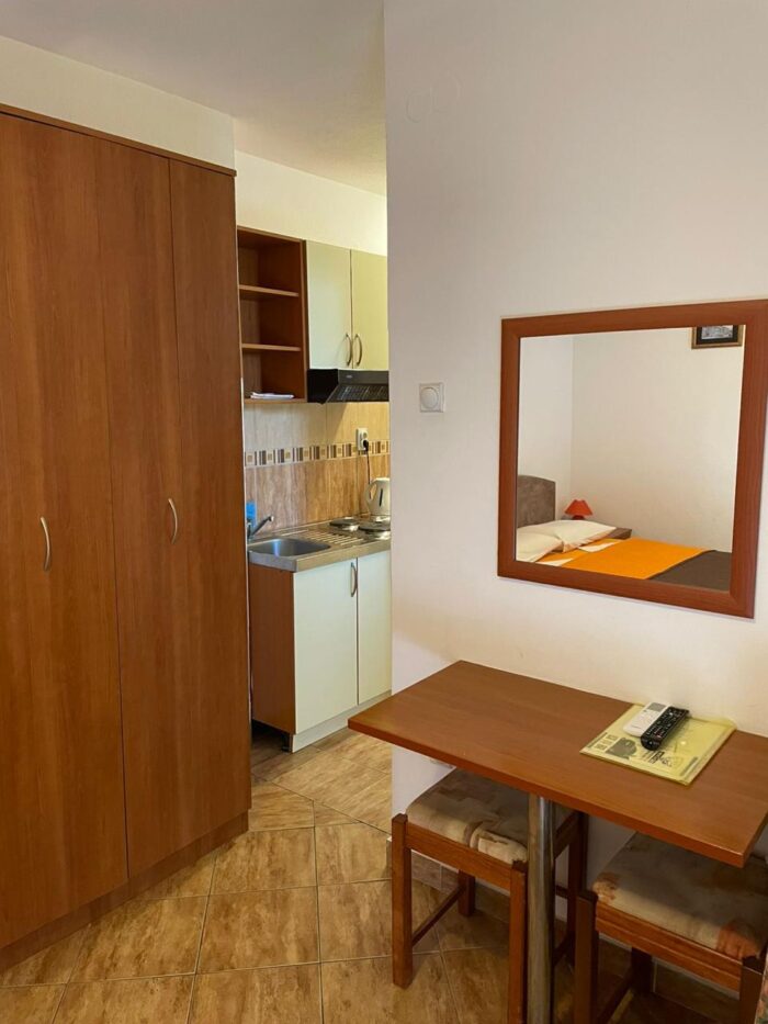 W apartamencie znajduje się aneks kuchenny z kuchenką i lodówką, który pozwala przygotować śniadanie, kolację lub prosty posiłek po powrocie z plaży. To duży atut przy wynajmie wakacyjnym w Czarnogórze i przy pobytach dłuższych niż kilka dni.