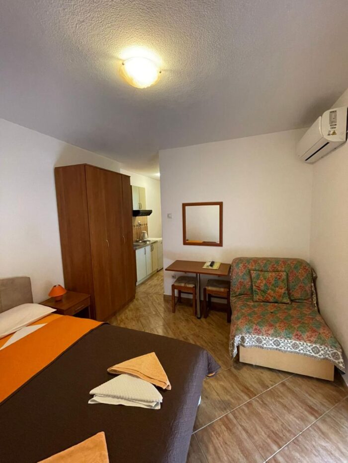 Apartament 3 to jasne, funkcjonalne studio wakacyjne w Czarnogórze, idealne dla 2–3 osób. Sprawdzi się zarówno na spokojne wakacje nad Adriatykiem, jak i na dłuższy pobyt poza sezonem, gdy tempo życia zwalnia, a okolica staje się cicha i kameralna.